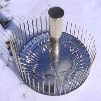 modernen klassischen Kompositionen Verwendung findet. Es besteht aus einem flachen runden Klangkörper aus Metall, der mit etwas Wasser befüllt wird. In der Mitte ragt ein Rohr auf, das zugleich als Schall-Loch, Griff und Einfüllöffnung für das Wasser dient. Außen am Rand sind viele unterschiedlich dünne und lange Klangstäbe angelötet, die mit einem Bogen, einem Schlägel oder mit den Fingern zum Klingen gebracht werden. Durch das Schwenken des Instruments fließt das Wasser im Klangkörper hin und her. Je nachdem wie weit der Boden mit Wasser bedeckt ist, ändert sich die Resonanz. Dadurch entstehen Klänge die an Walgesänge erinnern. Der Erfinder Richard Waters baut sein Waterphone aus industriell gefertigten Edelstahlblechen. Dadurch hat es einen speziellen Sound der zum Beispiel auch für Steeldrumms und Hangs charakteristisch ist. Martin Bläse verwendet für seine Waterphones gehämmerte Alpaka- (=Neusilber-) oder Bronzebleche, die auch für die Herstellung von Gong und Klangschalen Verwendung finden. Das ist zwar sehr viel aufwändiger, aber die Instrumente bekommen dadurch einen weichen, lange anhaltenden Klang. |